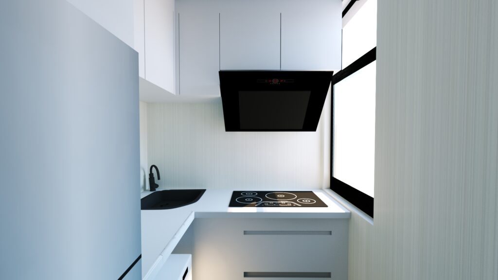 冰箱櫃的設計不僅美觀,也兼顧實用性。上方吊櫃增加儲物空間,並設有開孔,方便操作水掣。此設計也有效隔開冰箱與洗衣機,防止縫隙掉物,同時具備掛物功能。下方地櫃亦預留檢修口,方便維修水喉與煤氣表,並設有收納餐具與調味用品的空間。油煙機內部加設層板,讓小型廚房用品收納更有序。