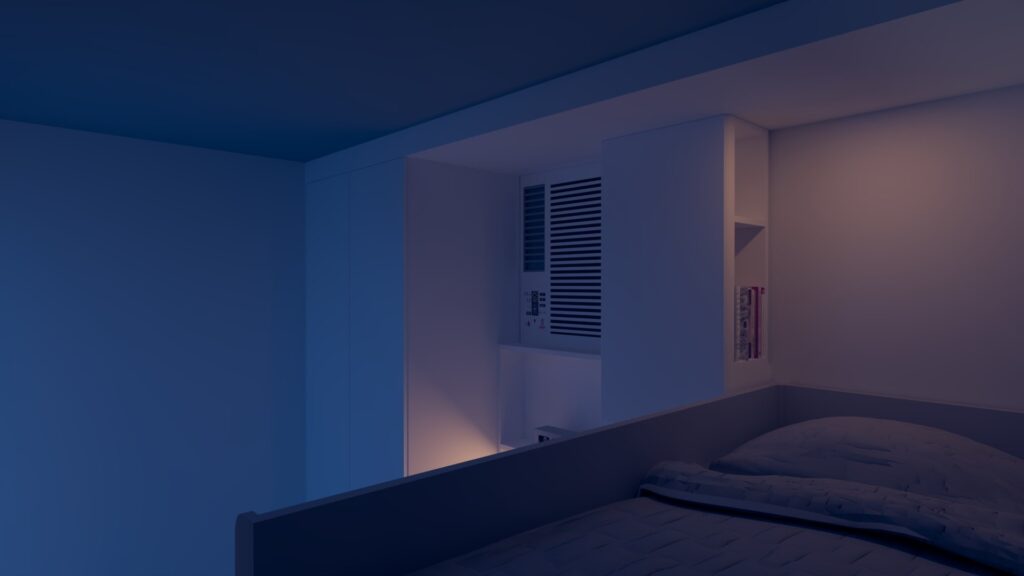 兒童房採用上下床設計,上床連接書櫃,內藏燈位與書架,方便小朋友睡前閱讀。書桌及書櫃考慮空調位置預留空間,並清晰區分文具、常用書本、玩具與電腦等功能區域,讓孩子讀書、收納更有條理。