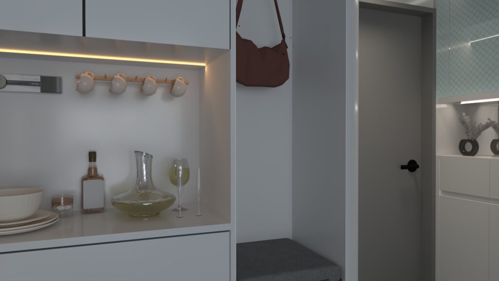 右側則設有L型C字櫃組,結合換鞋坐位與掛衣空間,可掛長外套或包包。櫃中部留空位置放置咖啡機、麵包機及酒杯,方便早上快速準備早餐。下層則藏有一組可摺疊餐桌與椅子,不用時可完全收納進櫃內,釋放活動空間。